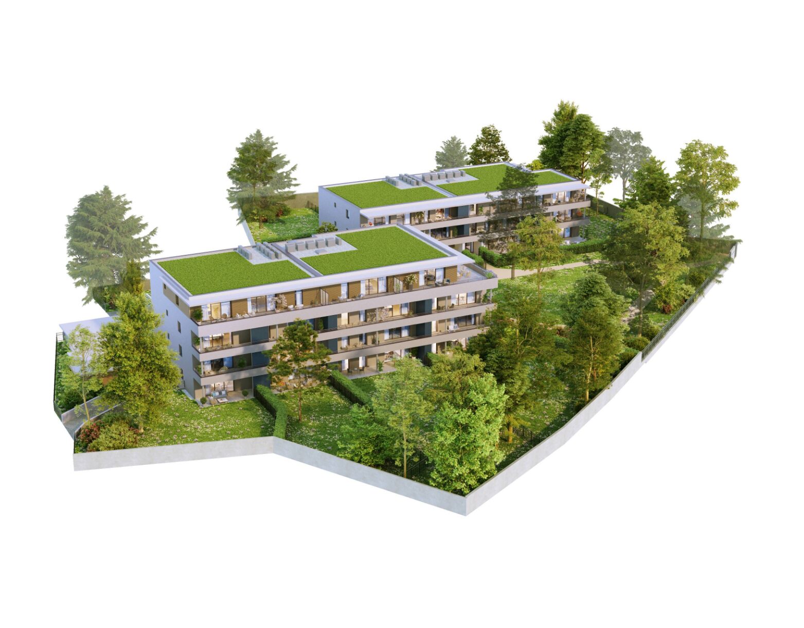 Cette propriété de deux bâtiments, se décline en appartements neufs du T2 au T4 dont les pièces se vie se prolongent sur de belles terrasses et/ou de grands jardins privatifs avec vue dégagée sur la nature.